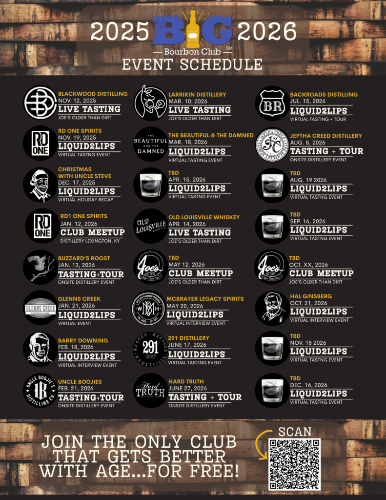 From distillery tours and live tastings to virtual events, interviews, and our signature LIQUID2LIPS experiences, the BIG Bourbon Club calendar is packed with unique ways to explore the bourbon world.
